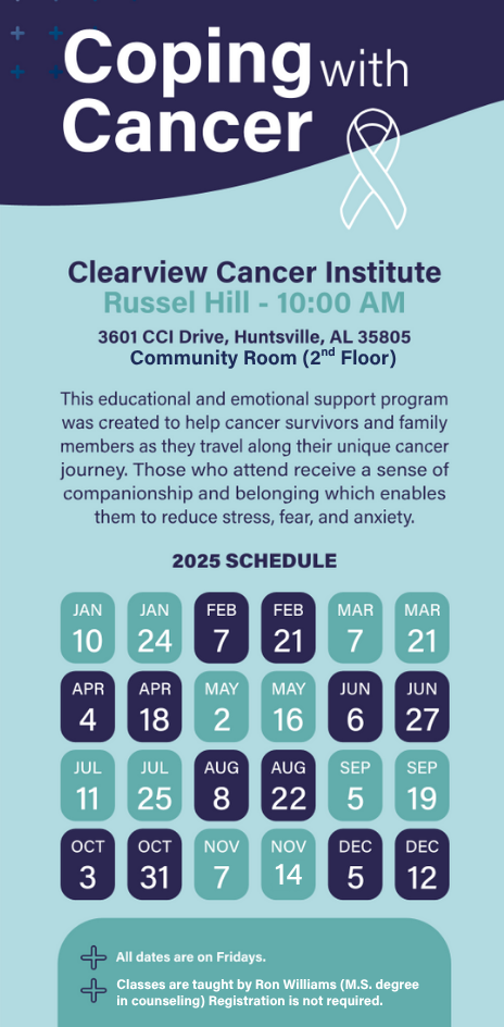 Coping with Cancer meets twice a month at the Huntsville – Russel Hill location, 3rd floor, East Room, 10:00am-11:00am. Please click here for a complete list of dates. For more information, please call 256-679-5558